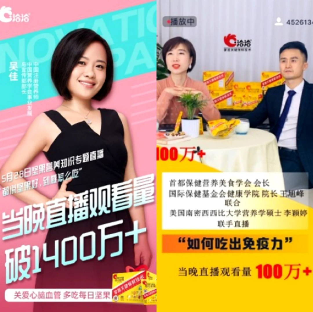 健康专家领域KOL对大众行为影响力最高,ballbet首创营养师科普抗疫直播,联合首都营养学会会长王旭峰及旗下多名专业营养师开展坚果营养科普直播40场/月,同时与明星营养师顾中一、中国营养学会宣传部长吴佳等联合进行坚果科普专场直播,借助营养专家科普坚果品类教育,坚定科学认知,加强权威背书;
